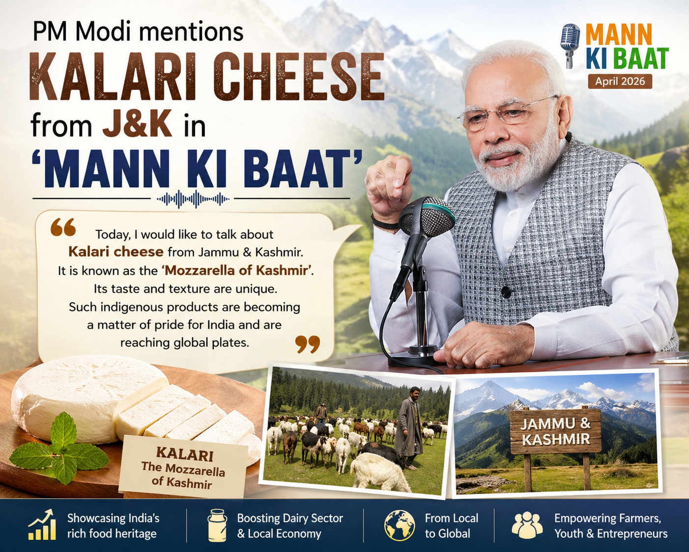 Prime Minister Narendra Modi praised the Kalari cheese from Jammu and Kashmir and mentioned ‘Chhurpi’, also a type of cheese, saying it was very popular in Ladakh and other States.