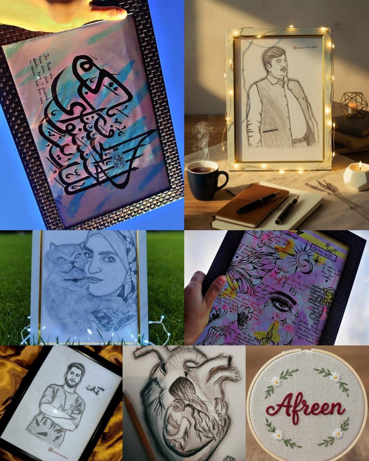 From a very young age, Afreen developed a love for different forms of art. Today, her portfolio includes a wide variety of creative skills such as calligraphy, sketching, quilling, crocheting, knitting, hoops embroidery, tilla handwork, decor crafts, and even poetry. Each of these reflects not only her dedication but also her desire to preserve traditional crafts while blending them with modern tastes.