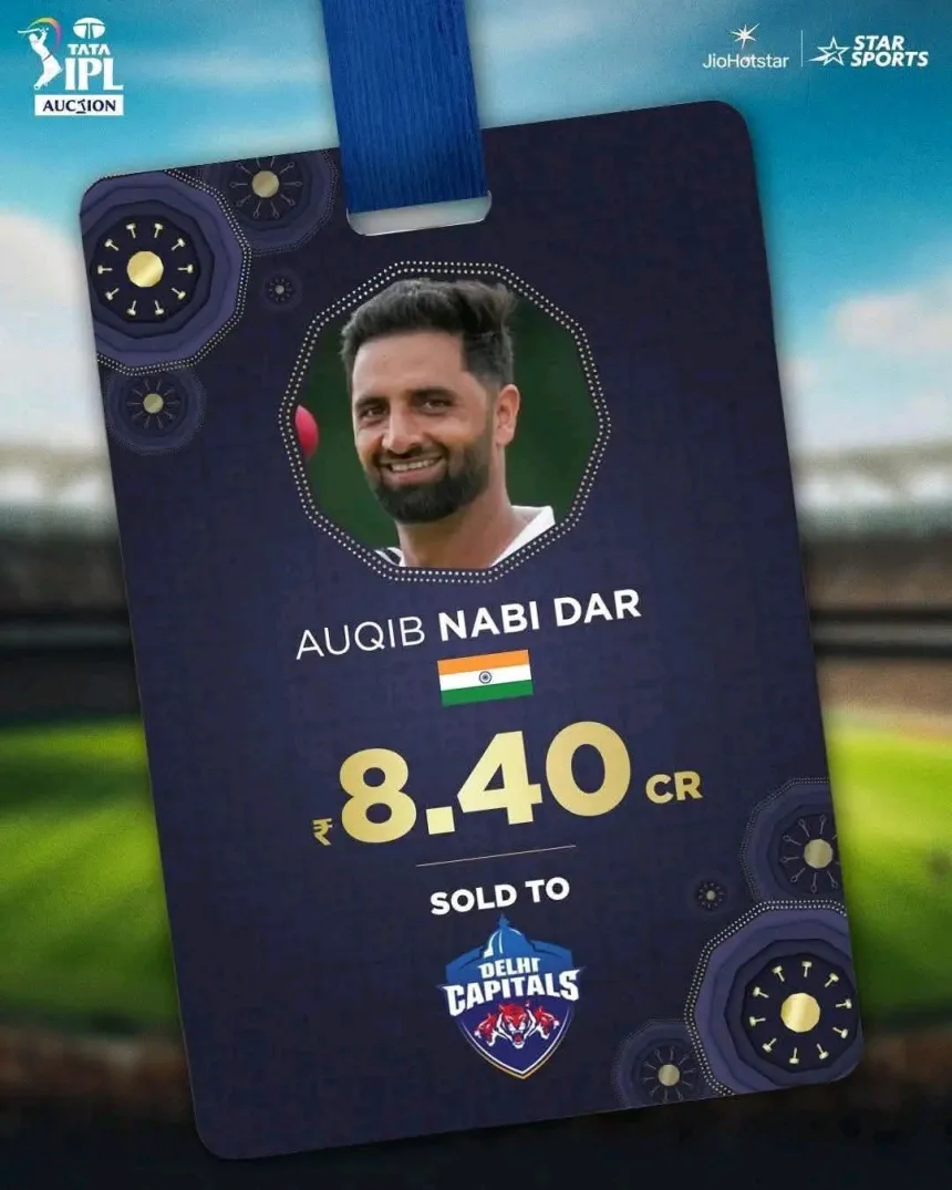 Jammu and Kashmir cricket witnessed a proud moment at the IPL Season 19 mini auction as Auqib Nabi Dar, a fast bowler from Baramulla, was snapped up by Delhi Capitals for ₹8.40 crore, emerging as one of the standout Indian signings of the auction.