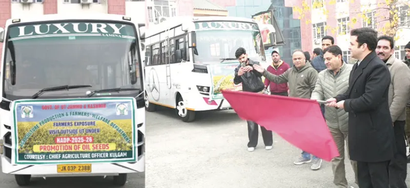 Under the Holistic Agriculture Development Programme (HADP), the Deputy Commissioner (DC) Kulgam Athar Aamir Khan flagged off 46 farmers of the district for a five-day exposure visit to Chaudhary Sarwan Kumar Himachal Pradesh Krishi Vishvavidyalaya (CSKHPKV), Palampur (HP) under the Promotion of Oilseeds programme, 2025–26.The exposure visit aims to familiarize farmers with advanced agricultural technologies, improved oilseed cultivation practices, and innovative farming techniques to enhance productivity and farmer’s income in the district.