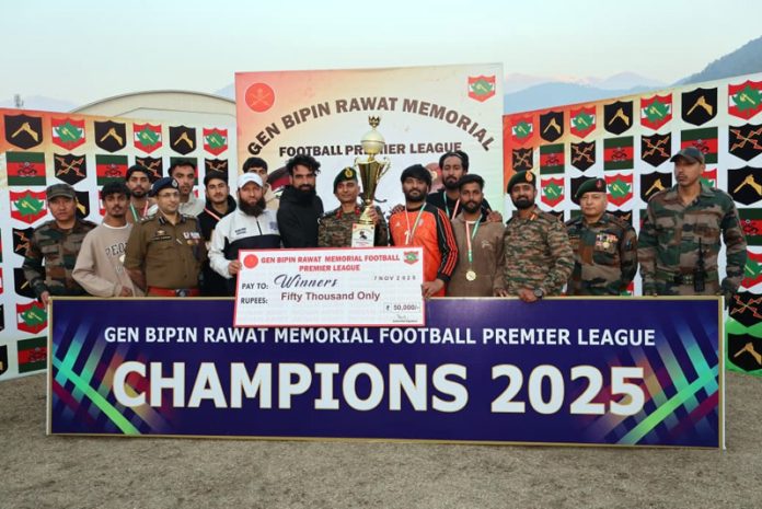 The inaugural General Bipin Rawat Memorial Football Premier League, organised by Chinar Corps’s Counter Insurgency Force (Kilo), concluded at Sher-e-Kashmir Stadium, here today. The tournament, held in honour of India’s first Chief of Defence Staff, aimed to promote sportsmanship, discipline and youth engagement in Kashmir.