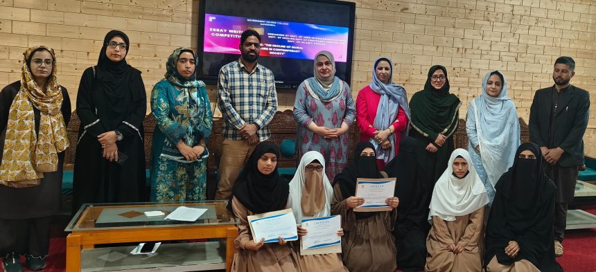 Government Degree College, Ganderbal Saturday organised a thought-provoking essay writing competition on the theme “The Decline of Moral Values in Contemporary Society: Causes, Consequences, and Solutions.” The competition, jointly organised by the departments of Urdu, Islamic Studies, English and Functional English, aimed at enhancing writing skills and raising awareness about the critical importance of moral values in modern society.