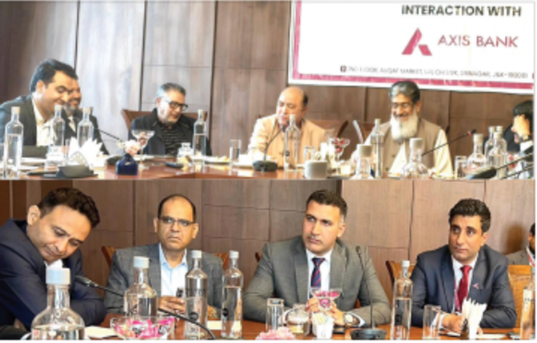 The Kashmir Traders & Manufacturers Federation (KTMF) on Thursday held a high-level interaction with senior management of Axis Bank in Srinagar, focusing on strengthening financial support and improving credit access for the business community in J&K.The meeting was attended by KTMF’s senior leadership, district presidents, and representatives of various trade bodies from across the Valley. The Axis Bank delegation included Vijay Shetty, President – Commercial Banking Coverage Group; Sunil Khatri, Senior Vice President (Working Capital Credit); Vineet Miglani, Senior Vice President (Risk Head); Kanwalbir Singh, Senior Vice President (Circle Head); Aadil Shah, Vice President & Cluster Head; and Gowher Sheikh, Vice President & Cluster Head.