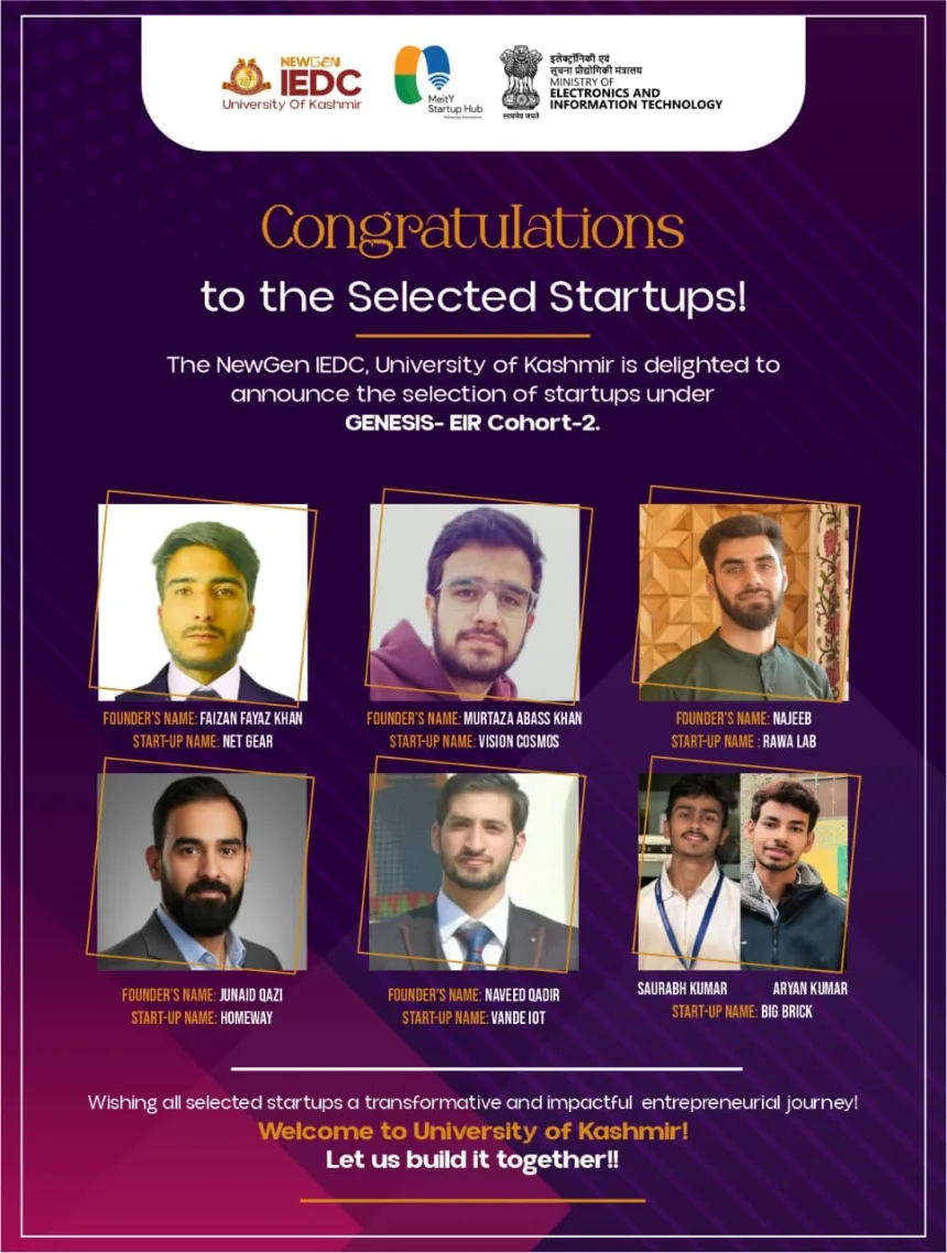 The University of Kashmir (KU) has selected six innovative startups for the MeitY GENESIS—Entrepreneur-in-Residence (EIR) Cohort-2 funding support.
